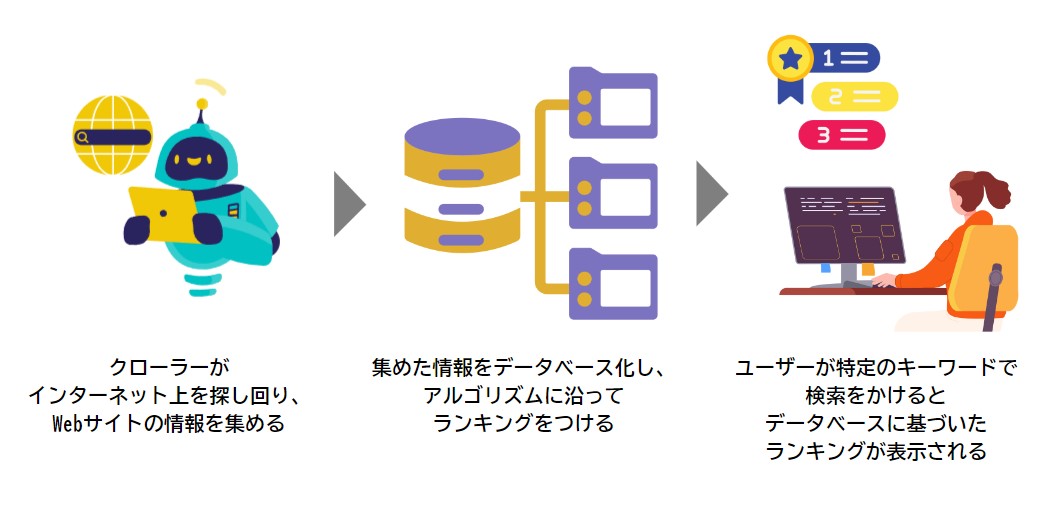 クローラーとはインターネット上の情報を集めるロボットのようなものです。クローラーはインターネット上を探し回って、新しいWebページや更新されたページを探し出し、集めた情報を整理します。整理された情報はデータベース化され、アルゴリズムにそってランキングがつけられます。このデータやアルゴリズムに基づいて、検索エンジンの順位が決定されます。そのため、まずはクローラーに自分のWebサイトを発見・認識してもらうことが非常に重要です。ちなみに、日本における検索エンジンのシェアはGoogleが圧倒的であるため、現在のSEO対策は主にGoogle検索を中心に行われています。