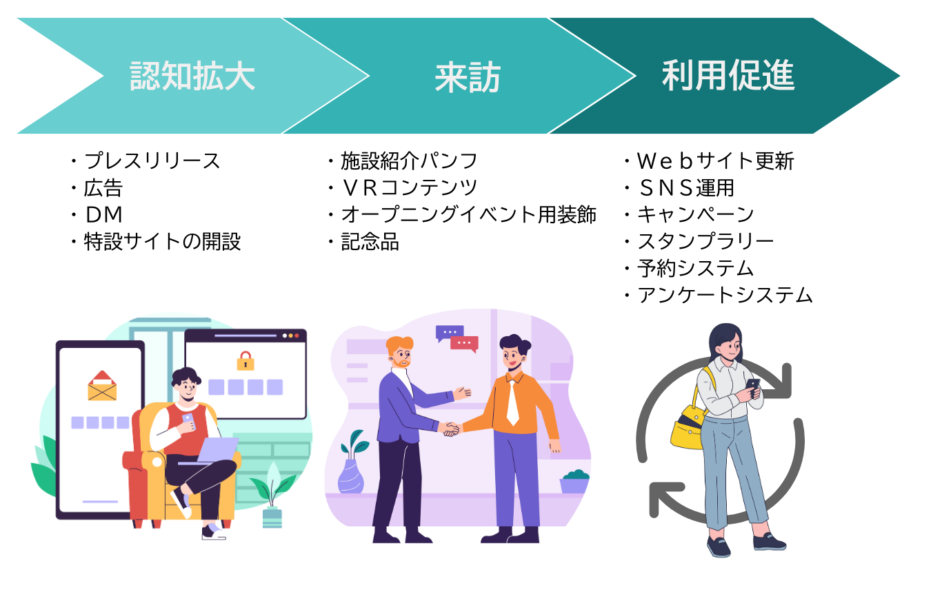 これらは、「認知拡大」「来訪」「利用促進」の3つのステップに置き換えて考えることができます。