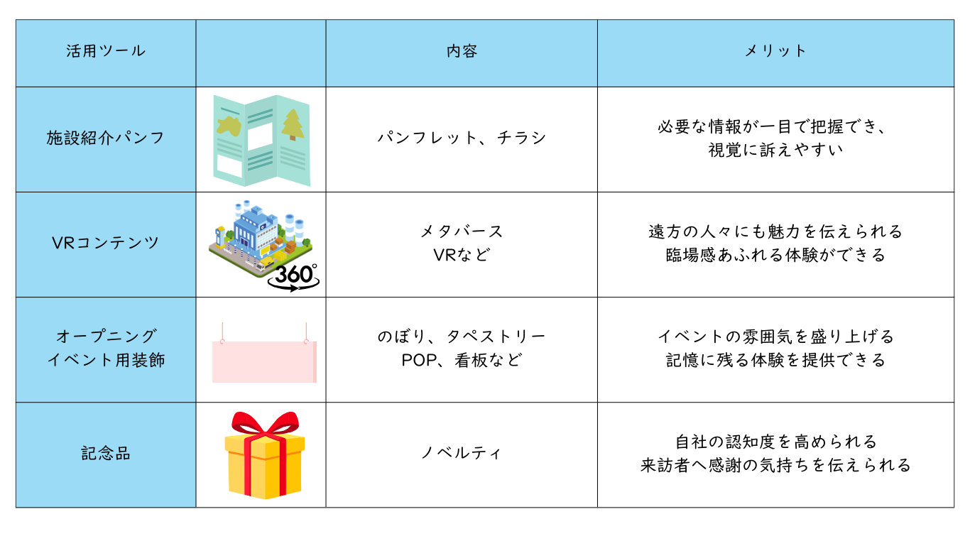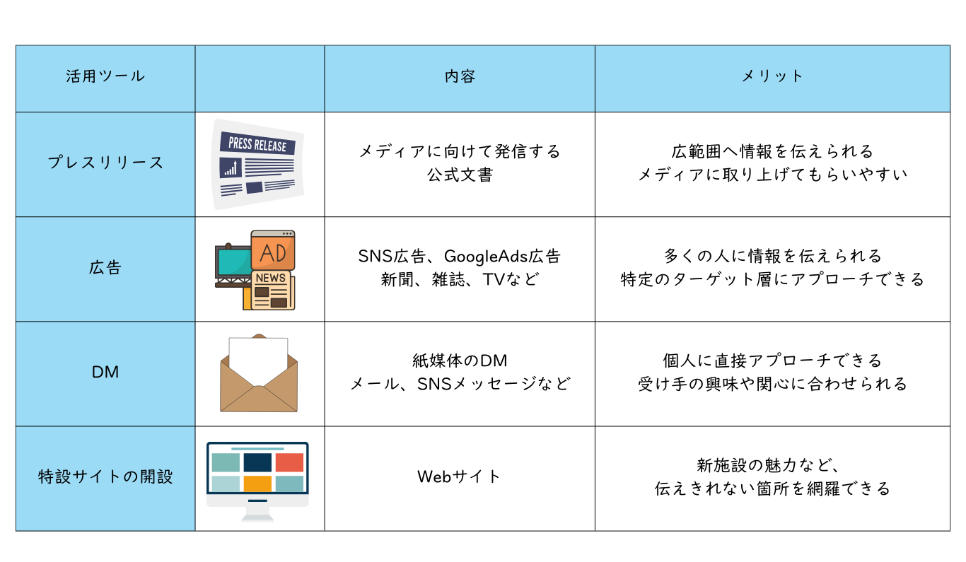 新施設をまずは知ってもらうことが大事です。「どんな人に知ってもらいたいのか?」「何を伝えたいのか?」ターゲットと伝えたいメッセージをはっきりさせることで、目的や用途に応じた最適な広報媒体を効果的に活用することができます。