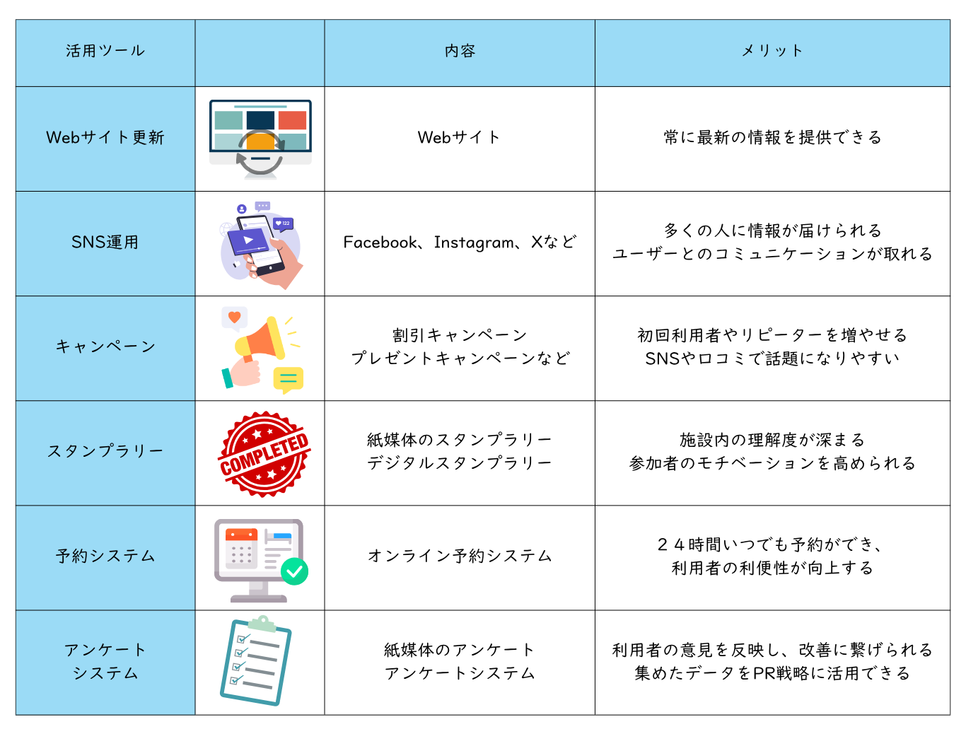 SNSを積極的に活用し、Webサイトと同じく、新施設に関する最新情報やイベント情報を定期的に更新し、関連記事を投稿します。Webサイトにはない、情報伝達力や速さがあり、すぐに伝えたい情報などにはおすすめです。またユーザーと直接コミュニケーションが取ることが可能です。