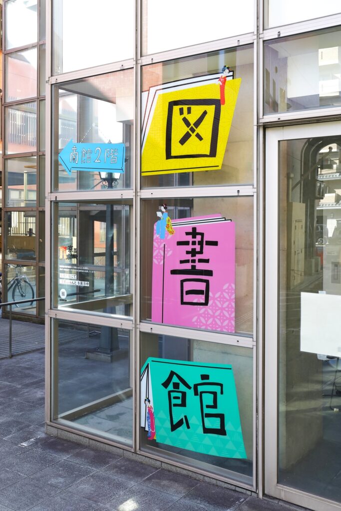 本展では、京都ふぉんとの新作を含む作品パネル展示に加え、庁舎1階窓ガラスの図書館案内掲示に「京都ふぉんと」を採用いただきました。